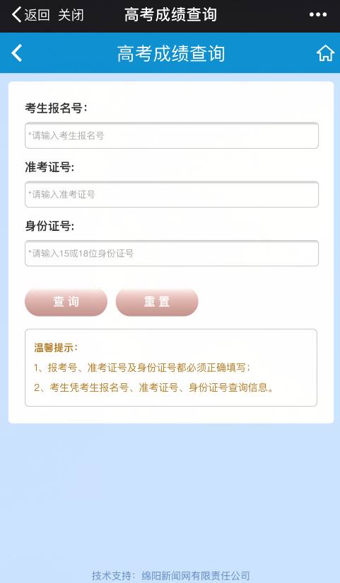 2017年高考成绩预计今(22日)晚10点左右公布,“绵阳考试招生”微信公众号将在第一时间开通成绩查询通道。“绵阳考试招生”是绵阳市招生办官方微信公众号,是绵阳权威发布高考成绩的唯一官方平台!
