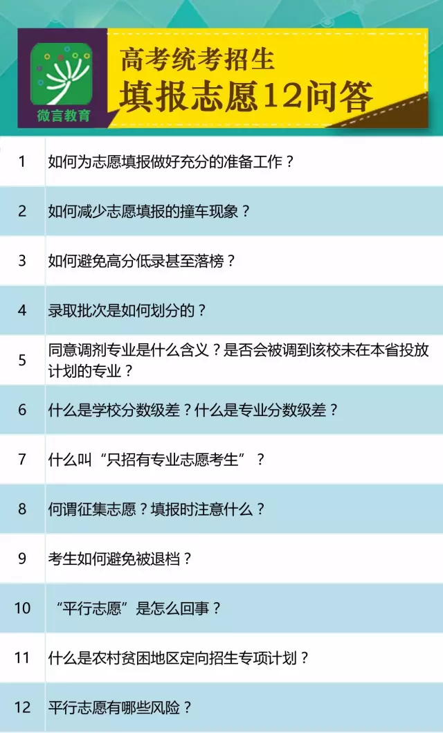 高考成绩、录取分数线已经出炉,接下来就是考生们填报志愿的时候了,怎样做准备?如何减少志愿填报“撞车”现象?录取批次是如何划分的?12问答为大家详解! 1. 如何为志愿填报做好充分的准备工作? 一是搜集院校资料,了解招生政策,熟悉有关规定,了解院校招生章程; 二是查询有关院校、专业近几年在各批录取分数和录取考生的位次情况; 三是了解今年在本省市招生的学校、专业、人数; 四是了解自己平时成绩、模拟成绩在全省、市的位次; 五是了解本人体检结果,避开限报的学校、专业。 2. 如何减少志愿填报的撞车现象? 一是考生应量体裁衣,根据自己高考成绩(或平时成绩、模拟成绩)的位次,对照往年各学校专业录取分数情况、位次情况; 二是注意填报时留有余地;注意体检结果,避开限报专业; 三是特别注意有的学校招生“大小年”现象,详细分析近年录取资料; 四是注意预报志愿后,考区、中学反馈的信息,如果出现扎堆现象,需要调整所报志愿。 3. 如何避免高分低录甚至落榜? 应坚持以下原则: 1、实事求是,找准自己的位置; 2、所填志愿拉开档次; 3、冷门与热门学校专业相结合; 4、省内与省外院校相结合; 5、避开体检结果所限学校、专业; 6、各批次学校志愿、专业志愿填满,尽量服从专业调剂。 4. 录取批次是如何划分的? 教育部《2017年普通高等学校招生工作规定》中明确:“各省级招委会要根据本地区招生工作的实际,合理安排高校录取批次。同一高校同一学历层次的招生计划原则上应安排在同一批次录取;如确有必要,经高校与有关省级招办协商一致,可以将同一高校的不同专业安排在属于同一学历层次的不同批次录取;但同一学校、同一专业、同一学历层次的全部招生计划,在同一省(区、市)须安排在同一批次录取,并执行经有关部门批准的相同学费标准。高校中外合作办学专业,应与本校在同一地区招生的其他专业安排在同一批次录取。高校被安排的录取批次与上一年度有变化的,省级招办应事先与高校协商一致后,再向社会公布。” 5. 同意调剂专业是什么含义?是否会被调到该校未在本省投放计划的专业? 由于考生填报专业志愿不均衡,专业录取生源冷热不均,有的专业出现计划空额,有的专业考生爆满。高校为完成国家招生计划,需要将志愿专业落选考生调拨到招生不满的专业。所以填报志愿时设计了“服从专业调剂”栏,由考生选择。 当所报专业(从第一个专业到最后一个专业)都无法录取时,考虑考生是否“服从专业调剂”。如果“服从专业调剂”,意味着该院校在本省该批招生的任何专业都可被录取,但不会被调到该校未在本省投放计划的专业。此时,如果还有专业可以调剂,则调剂到该专业录取,如果所有专业都已录满,则退档。如果不服从调剂的话,当所报专业都无法录取时,直接退档。 6. 什么是学校分数级差?什么是专业分数级差? 学校志愿分级差是指录取非第一院校志愿考生时的分数差额。例如:某高校规定的志愿级差为20分,第一志愿调档分数线为600分,那么,第二志愿的调档分数线就为620分。第一志愿生源充足而且规定了志愿级差的院校,省招办按投档比例投完第一志愿考生档案,再按院校提出的志愿级差将第二志愿且分数在级差之上的考生档案投放给学校,由学校审核录取。在实行平行志愿投档模式的批次,不存在学校分数级差。 部分高校在分配专业时规定了专业级差,专业级差是指录取非第一专业考生时的分数差额。例如:某一学校规定专业级差为3分,学校在分配专业时,将第二专业志愿的考生成绩减去3分后,和第一专业志愿的考生一起排序确定专业。没有规定专业级差的学校,在分配专业时,有的采取专业志愿优先的原则,即首先满足第一专业志愿考生;有的采用分数优先的原则,优先录取分数高的考生。 7. 什么叫“只招有专业志愿考生”? “只招有专业志愿考生”是指学校某一专业只招收填报本专业志愿的考生,不招收未填该专业志愿的。即使考生“服从专业调剂”,也不会被调剂到这些专业。 8. 何谓征集志愿?填报时注意什么? 征集(征询)志愿是指在每一批次录取结束之后,省级招办将录取未满额的院校和余缺计划数向社会进行公布,供尚未被录取并达到分数要求的考生进行选报。征集志愿填报须注意以下五点: 1.达到分数要求且未被录取的考生才能填报; 2.考生要注意及时了解省级高招办公布尚未完成招生计划院校的余缺信息,必须在规定的时间内完成填报,逾期则不能再填报; 3.参加征集志愿填报的考生按规定选报院校志愿; 4.考生选报征集志愿时要考虑避免再次出现“扎堆”落选的问题; 5.考生要谨慎选择,如考虑所报院校剩余的专业自己能否接受,一旦被录取就不能退档调换。 9. 考生如何避免被退档? 高校退档的主要理由:总分偏低;单科成绩低;身体条件受限;专业不服从调剂等。 为避免退档,应注意以下几点: 一是了解院校信息,特别是招生章程、近几年招生录取分数情况; 二是量力而行,切忌好高骛远,选报志愿留有余地,参考各校专业录取的平均分、位次。 三是严格对照《普通高等学校招生体检工作指导意见》相关条款,选报志愿要避开不予录取的专业。 四是选择专业面要宽,尽量服从专业调剂。 10. “平行志愿”是怎么回事? 所谓平行志愿,即指采用平行志愿录取投档,考生在同一位置所选的A、B、C、D等志愿之
