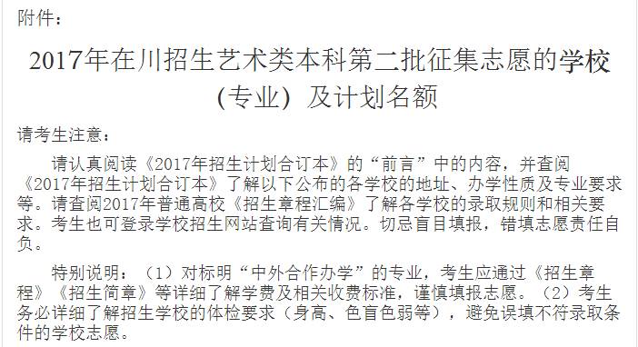 附件:2017年在川招生艺术类本科第二批征集志愿的学校(专业)及计划名额