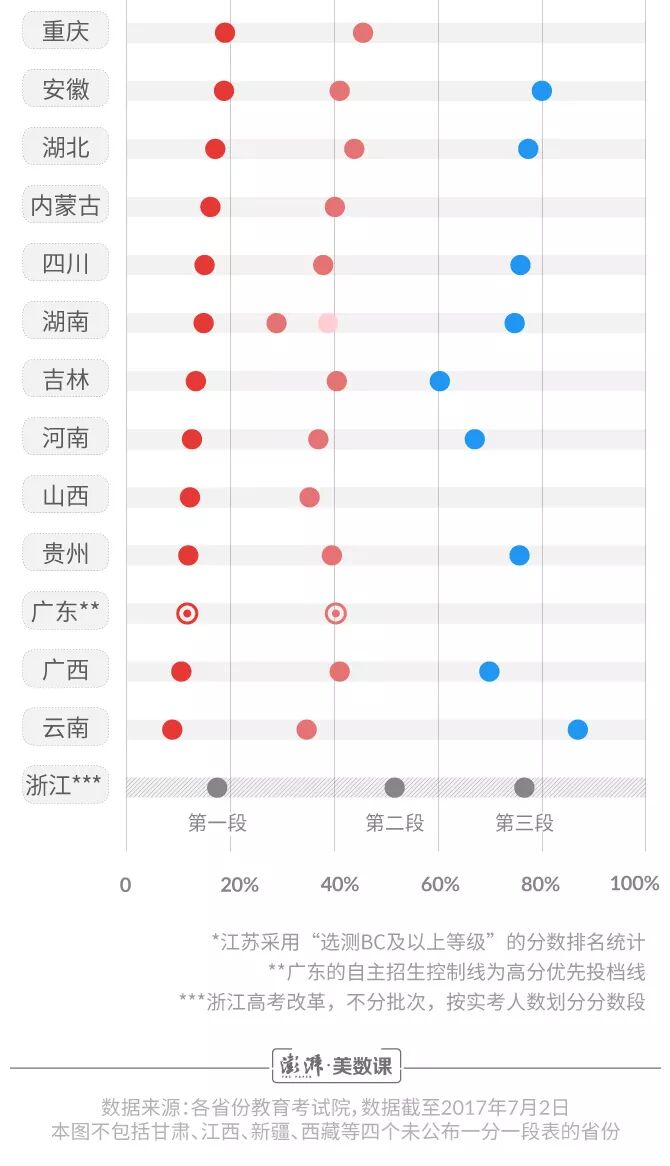 相比之下,一本上线率最低的三个省(市、区)分别为贵州、广西、云南,具体分别为12%、10%和8%。